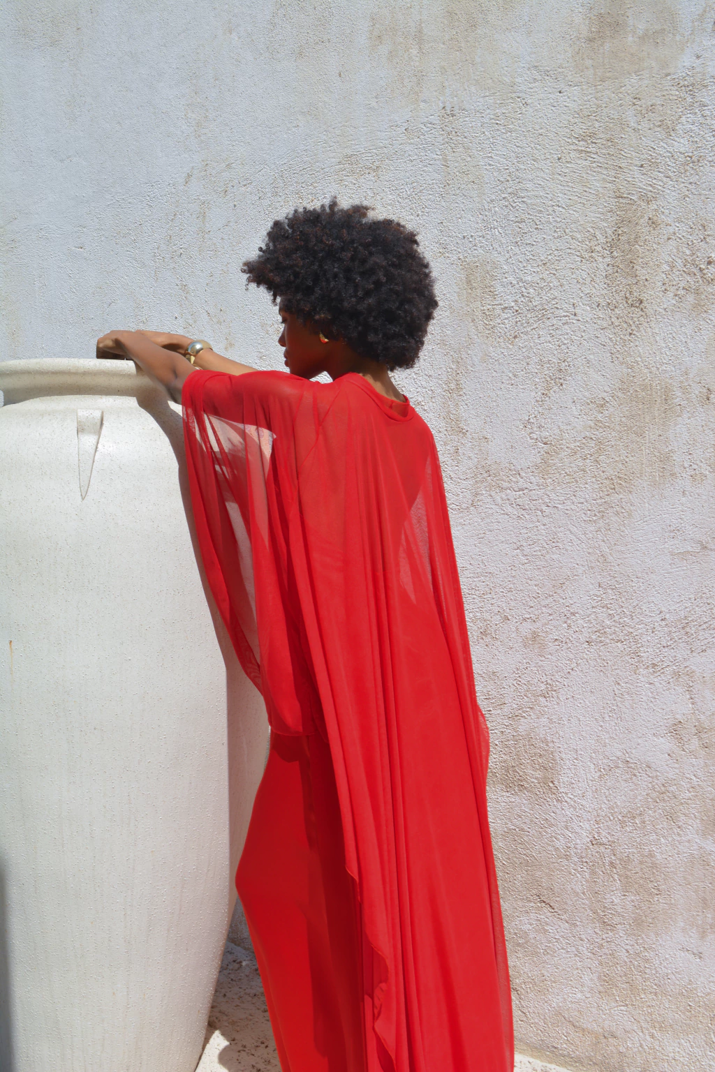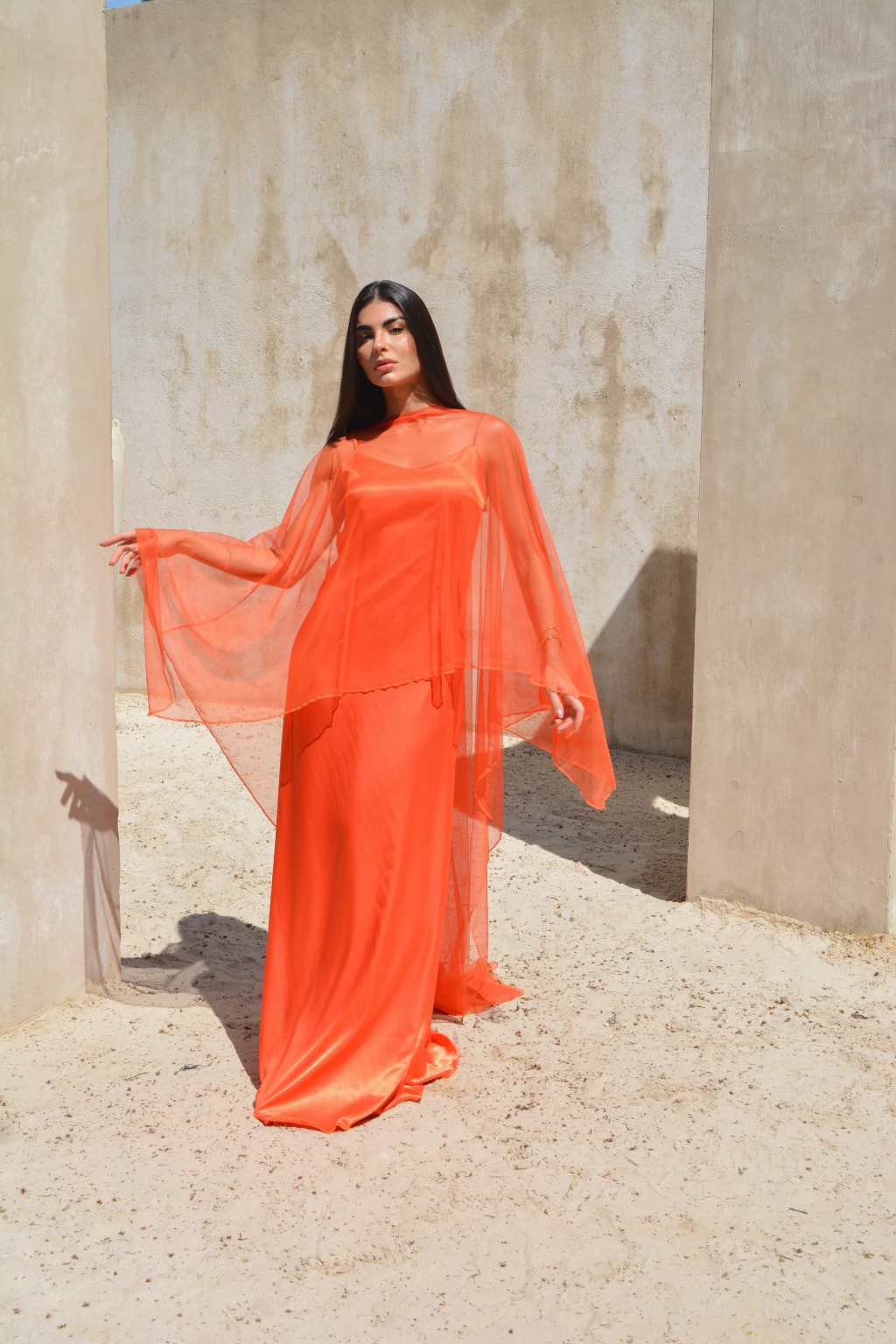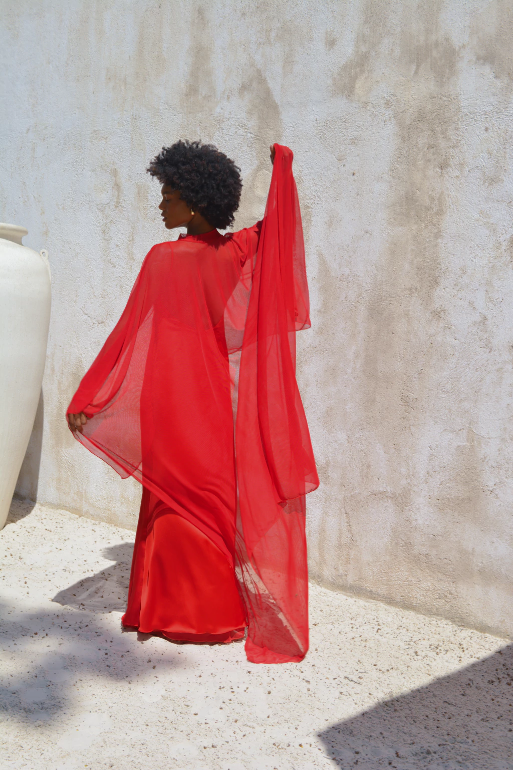 Vestido longo com decote discreto na frente e atrás, com fechamento em zíper nas costas, acompanha tule como poncho alongado, saia em A quase reta.