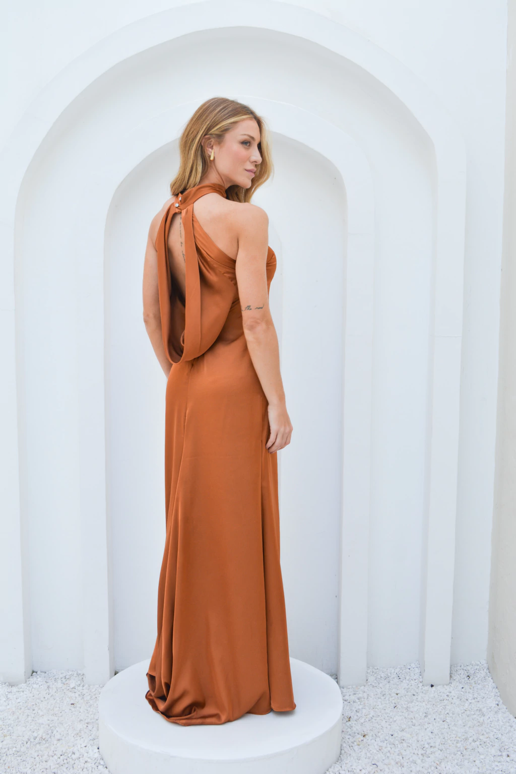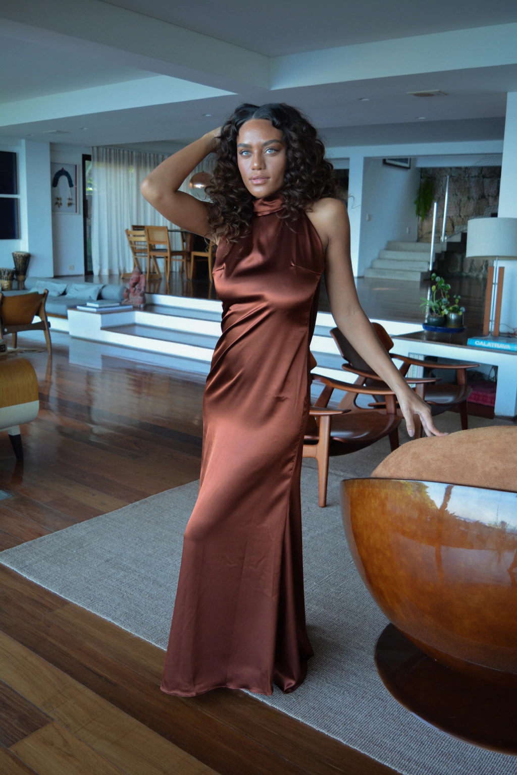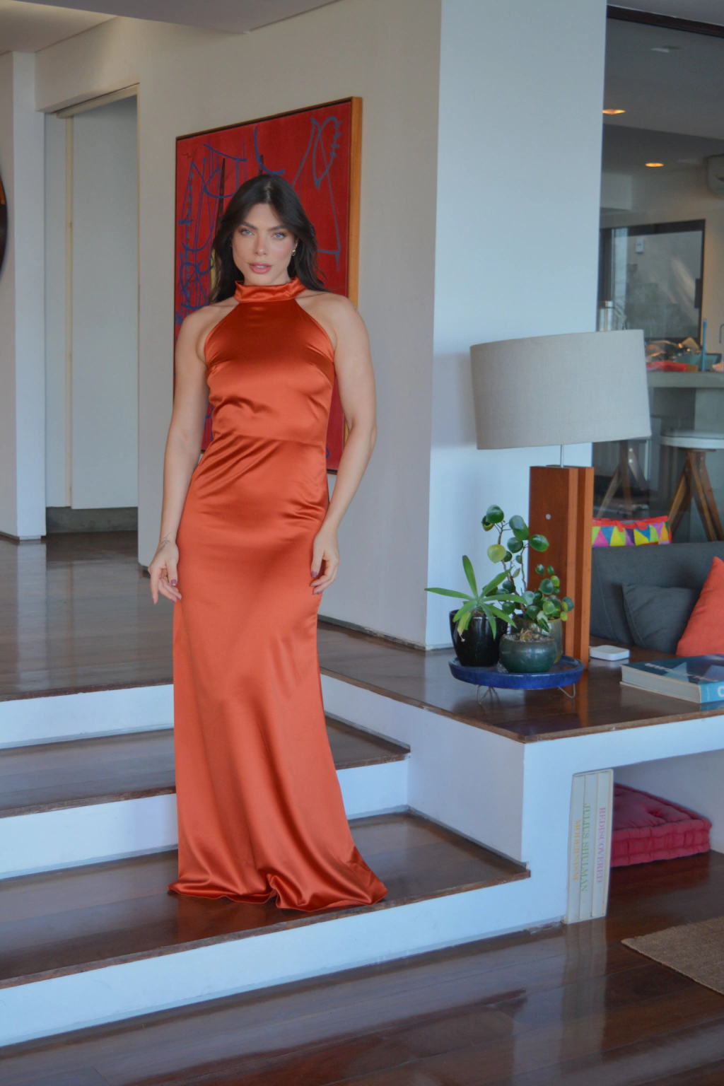 Possui decote nadador, abertura nas costas com caimento, saia sereia, com fechamento em botão na nuca.