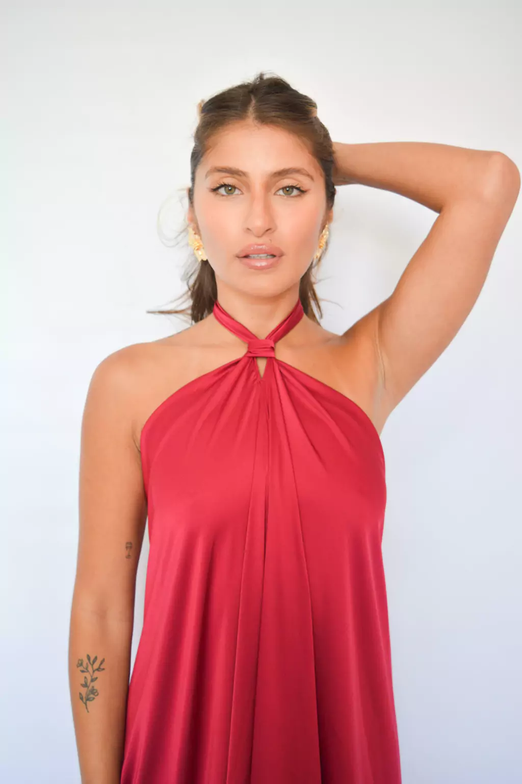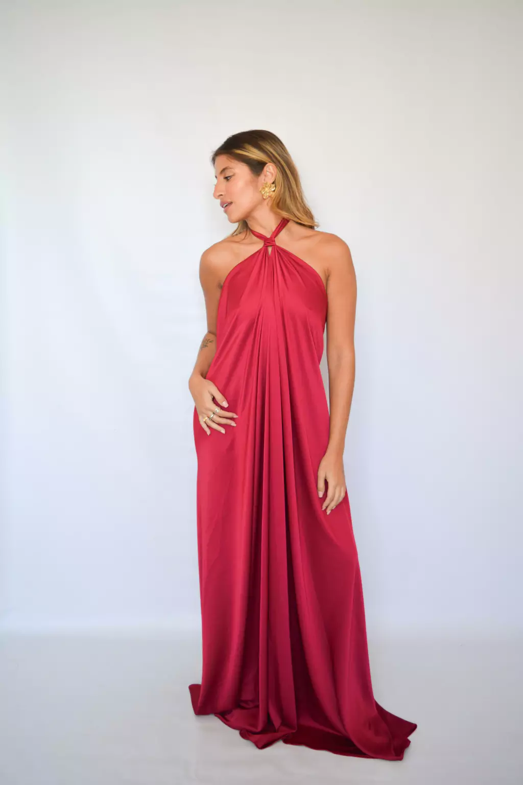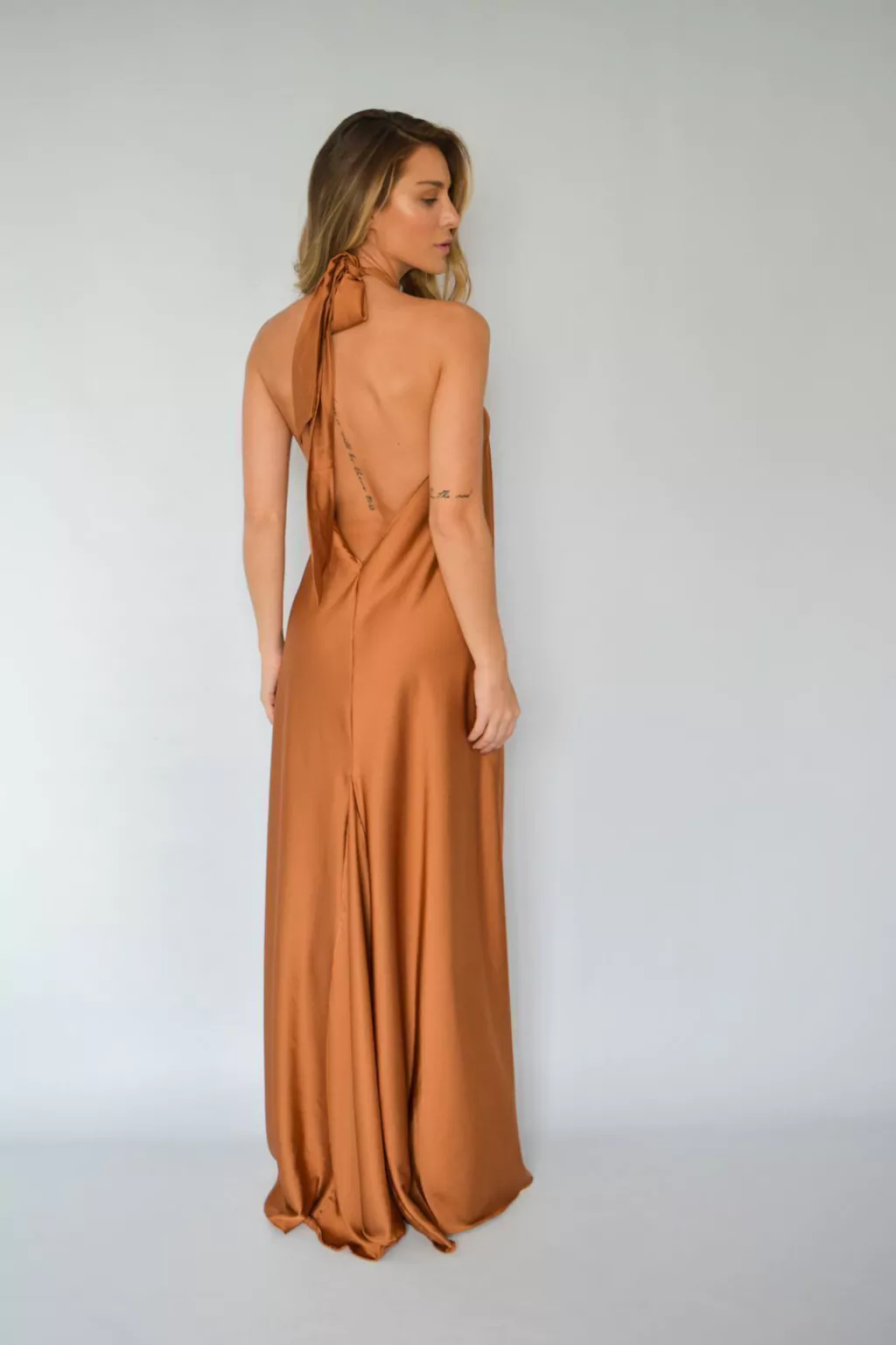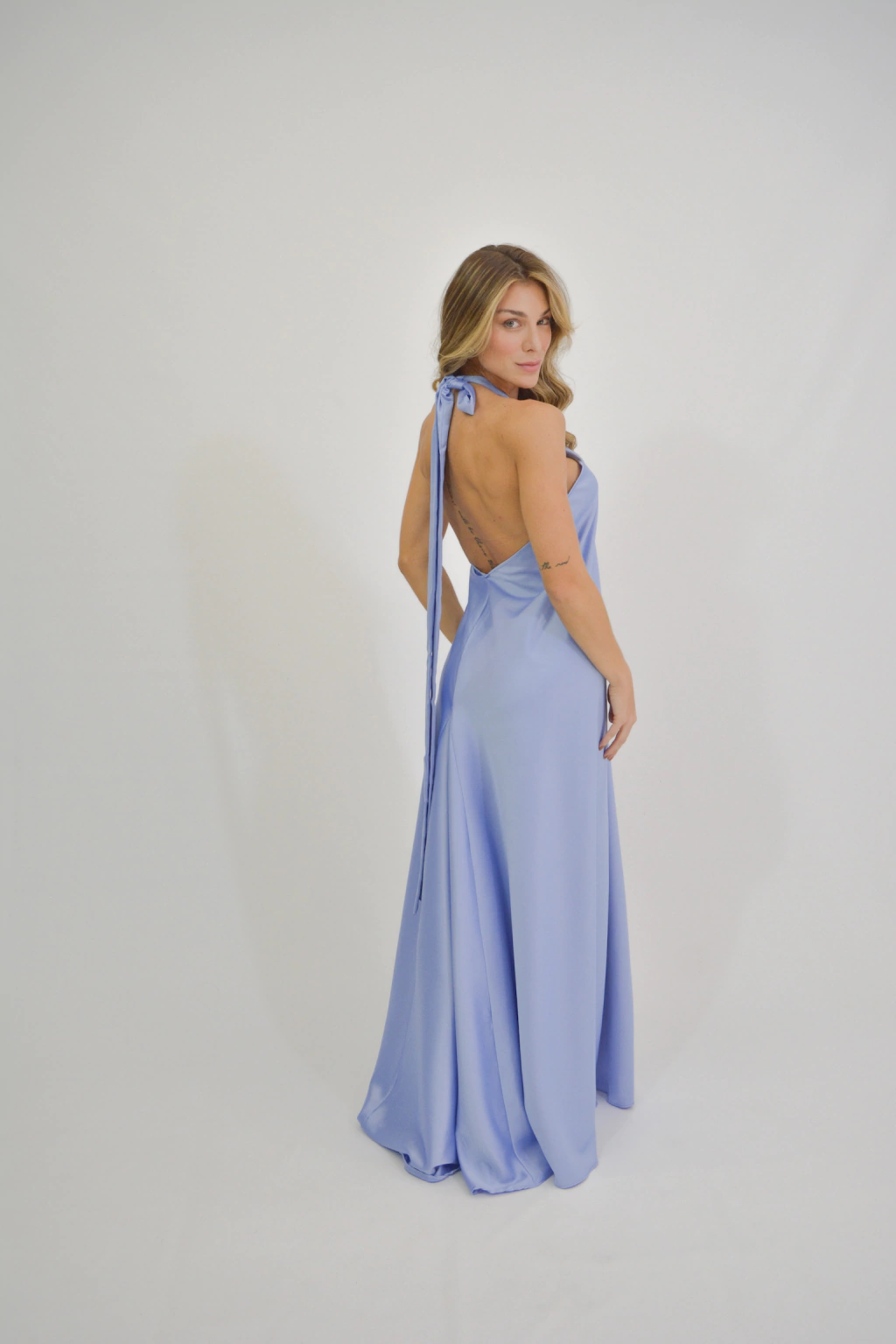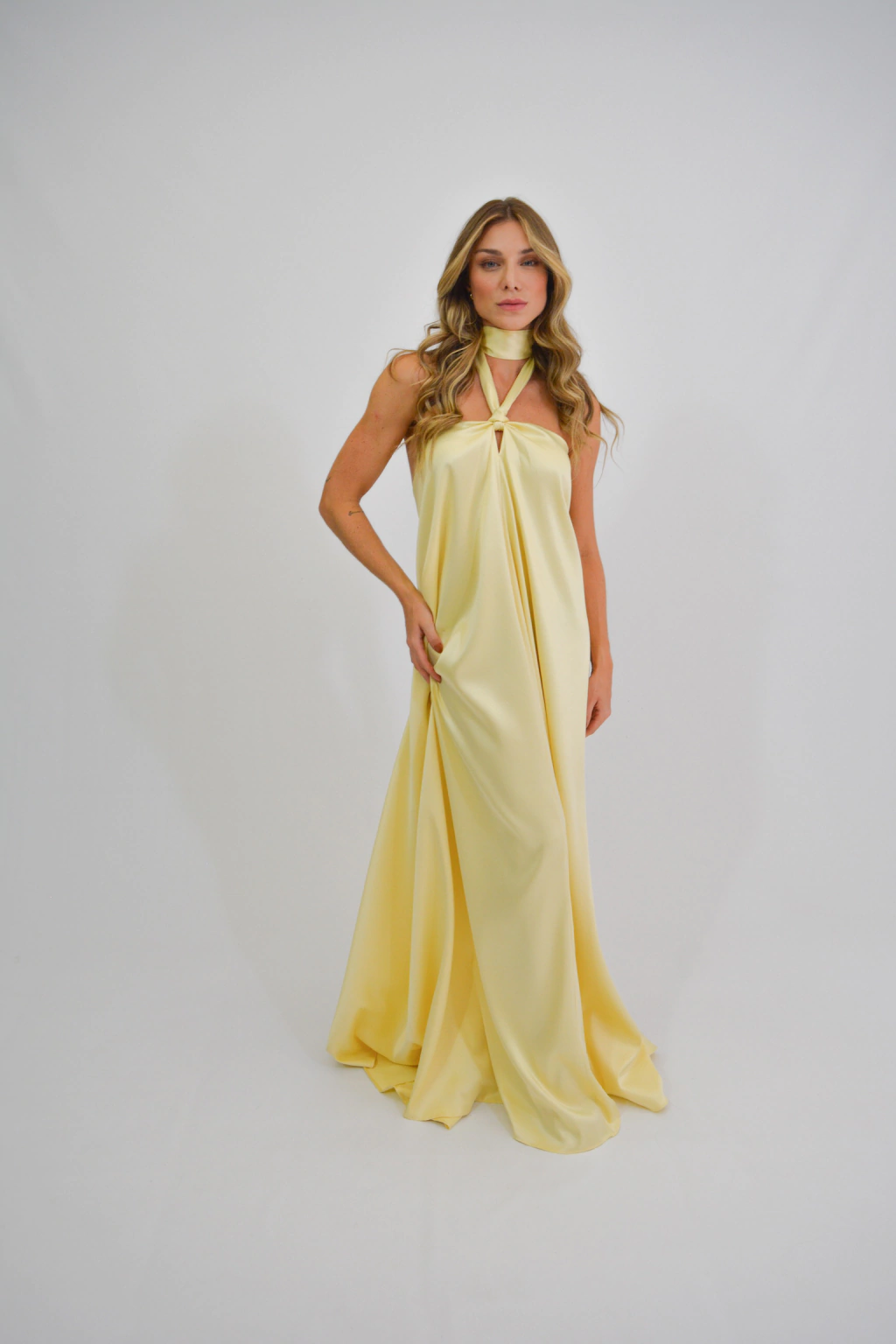 Vestido longo bahia, modelagem frente única, com amarração na nuca.