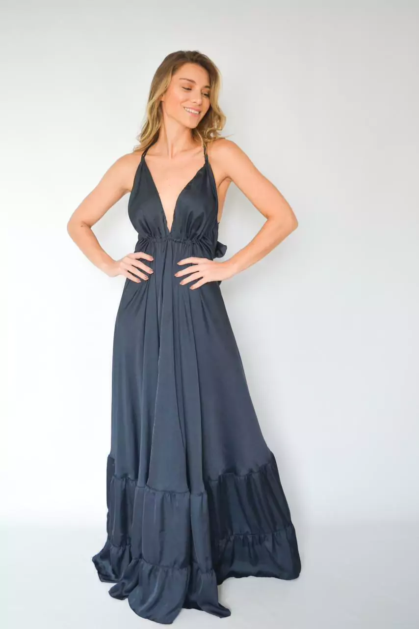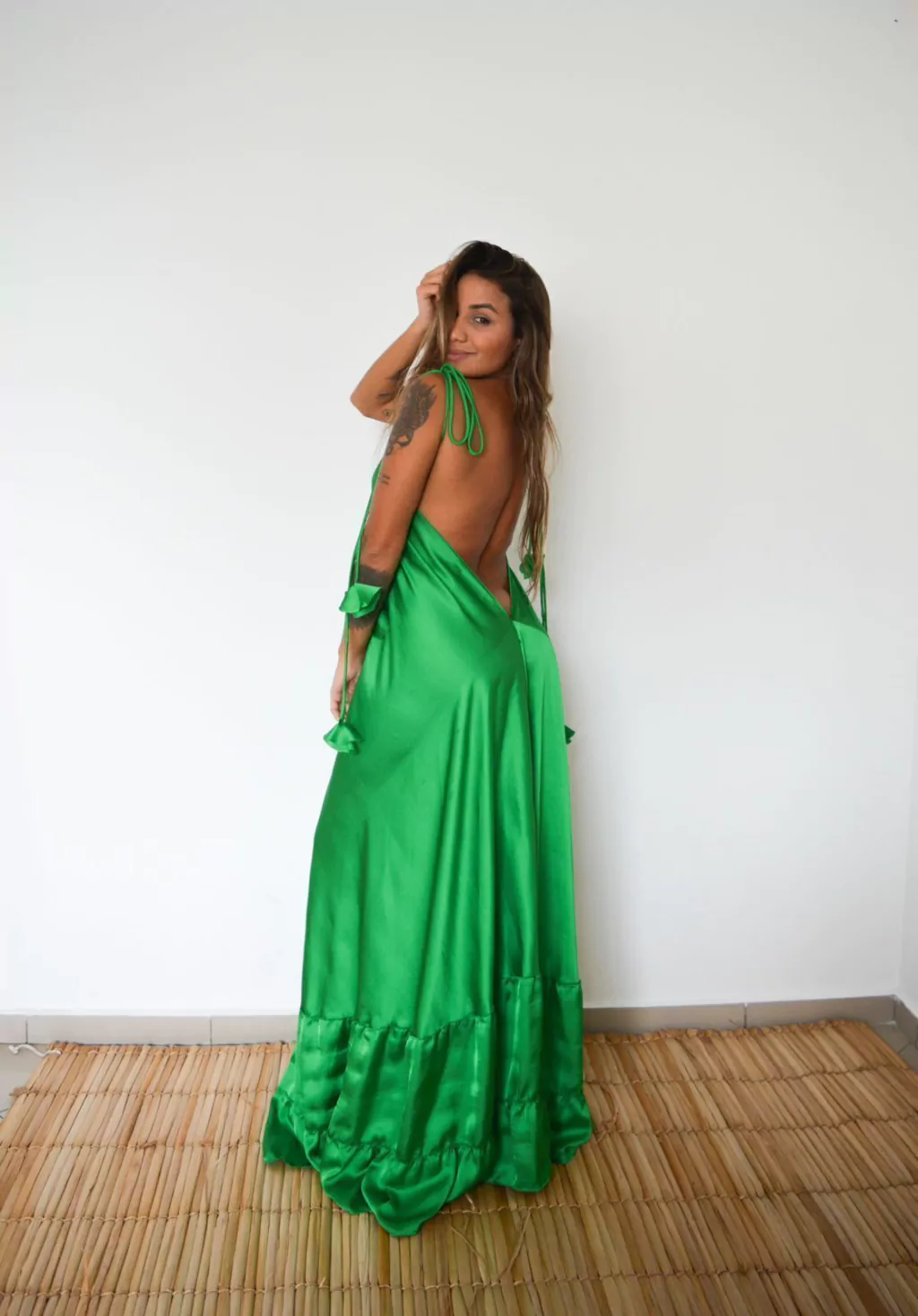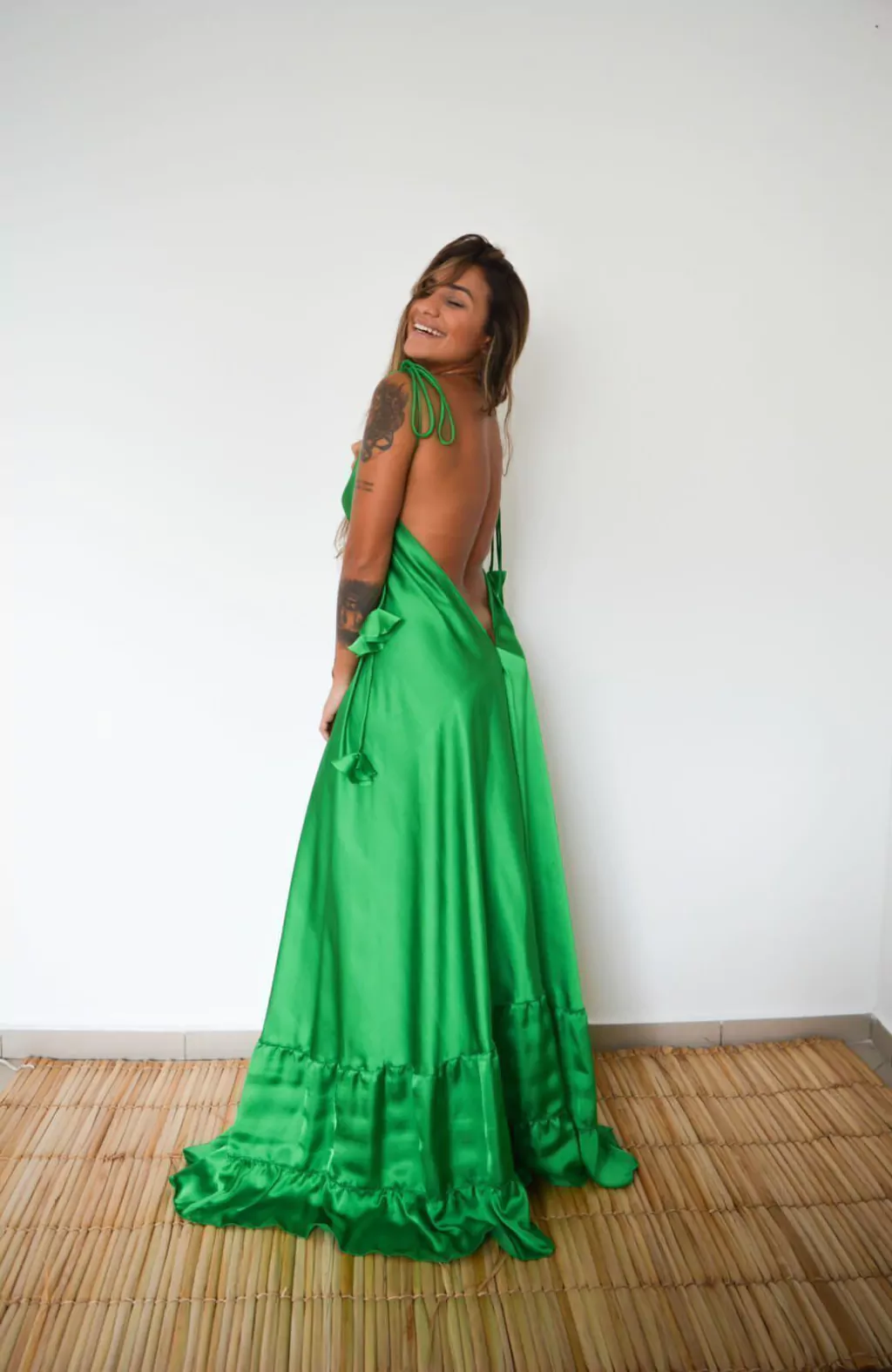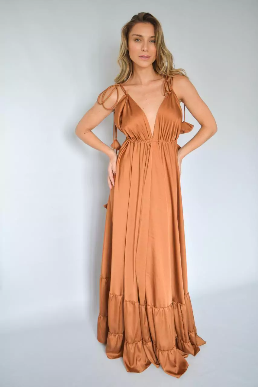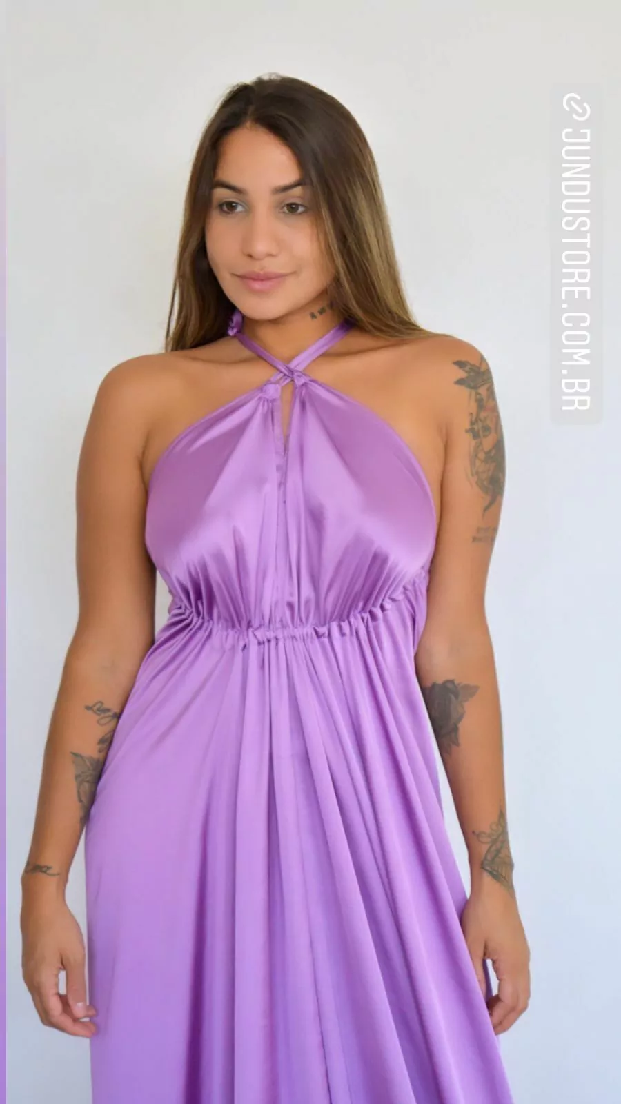 Vestido longo com decote frente e costas, possui diversas opções de amarrações e detalhe na barra e nas alças, modelo de saia A.