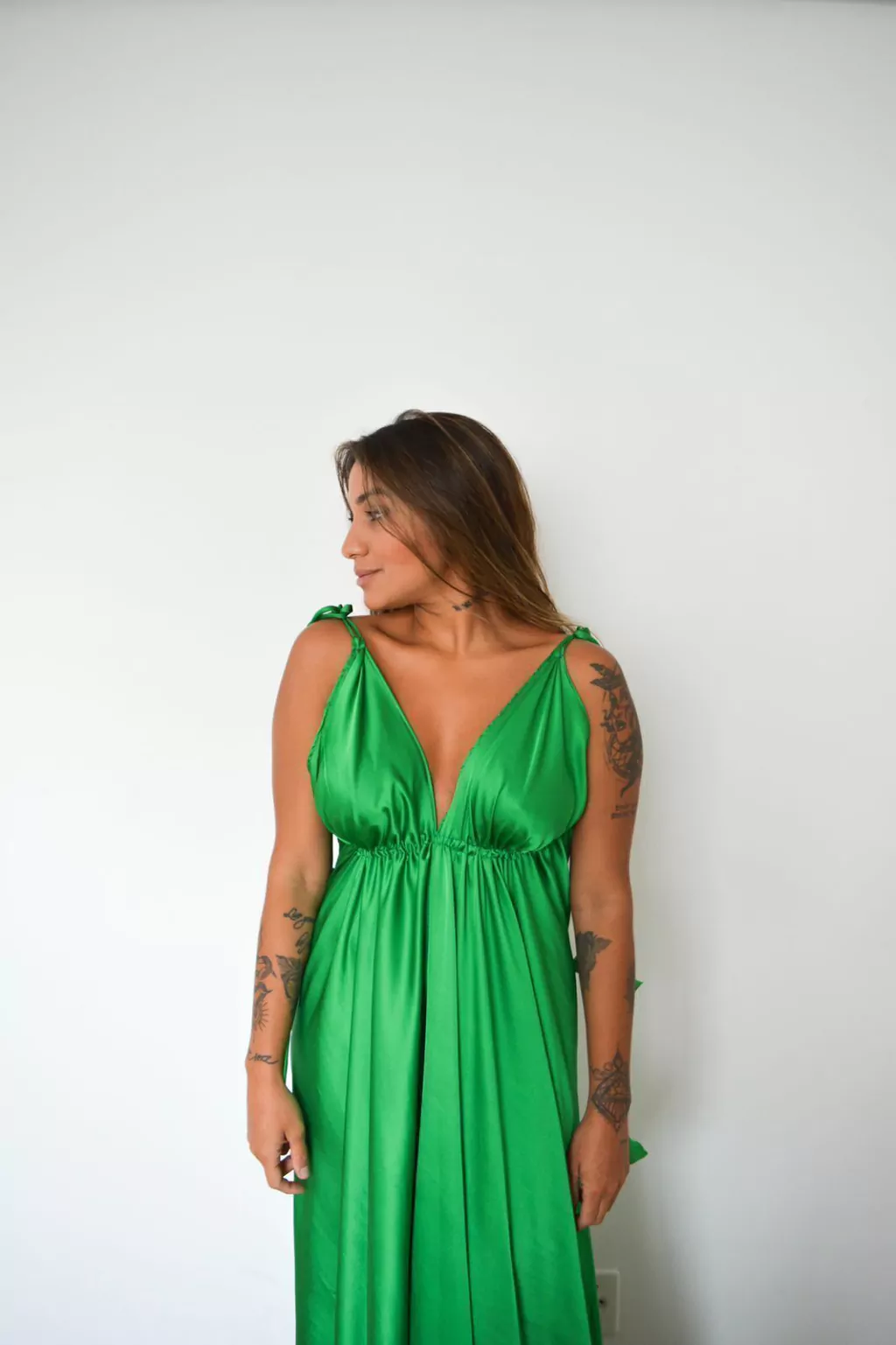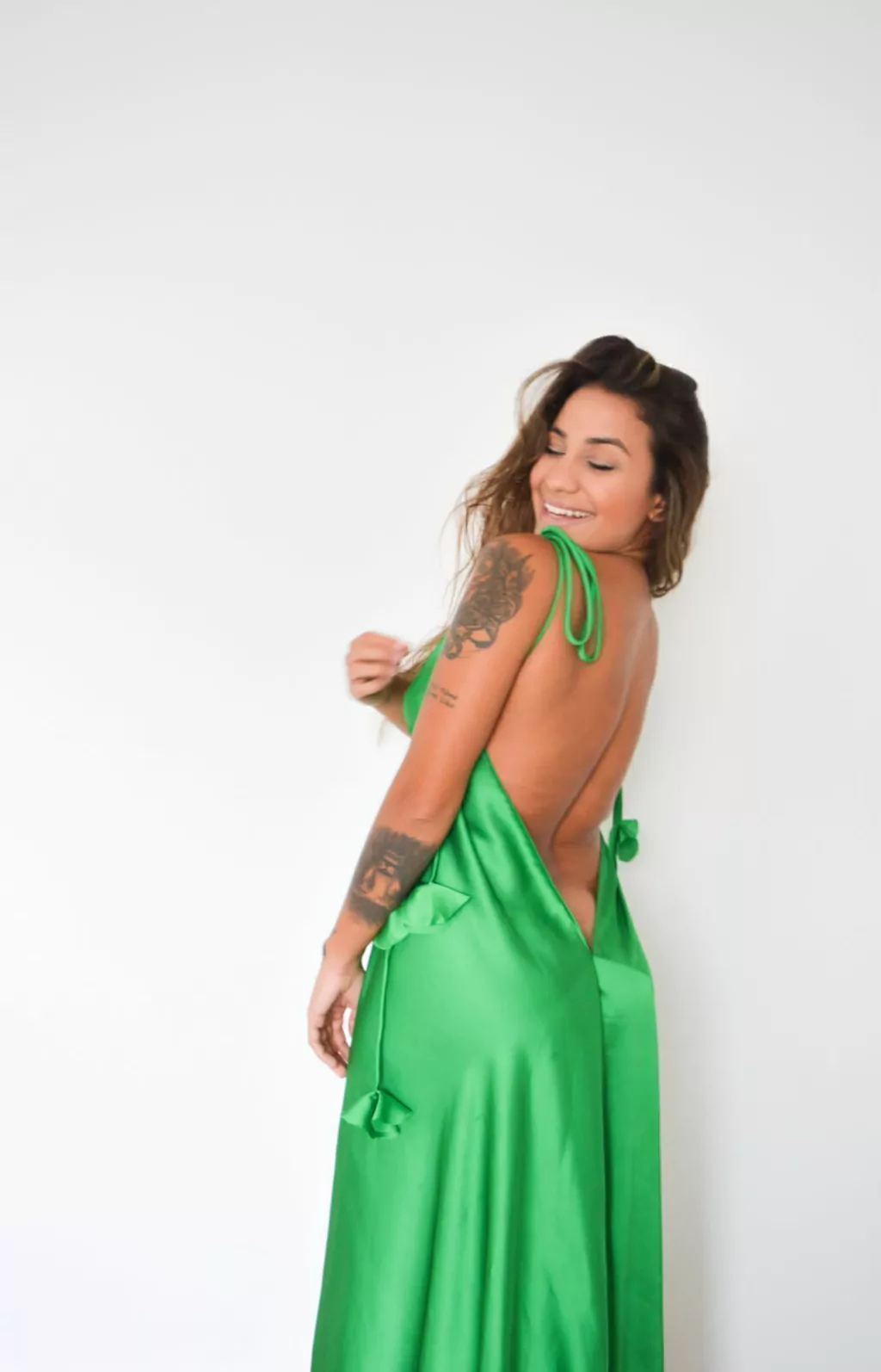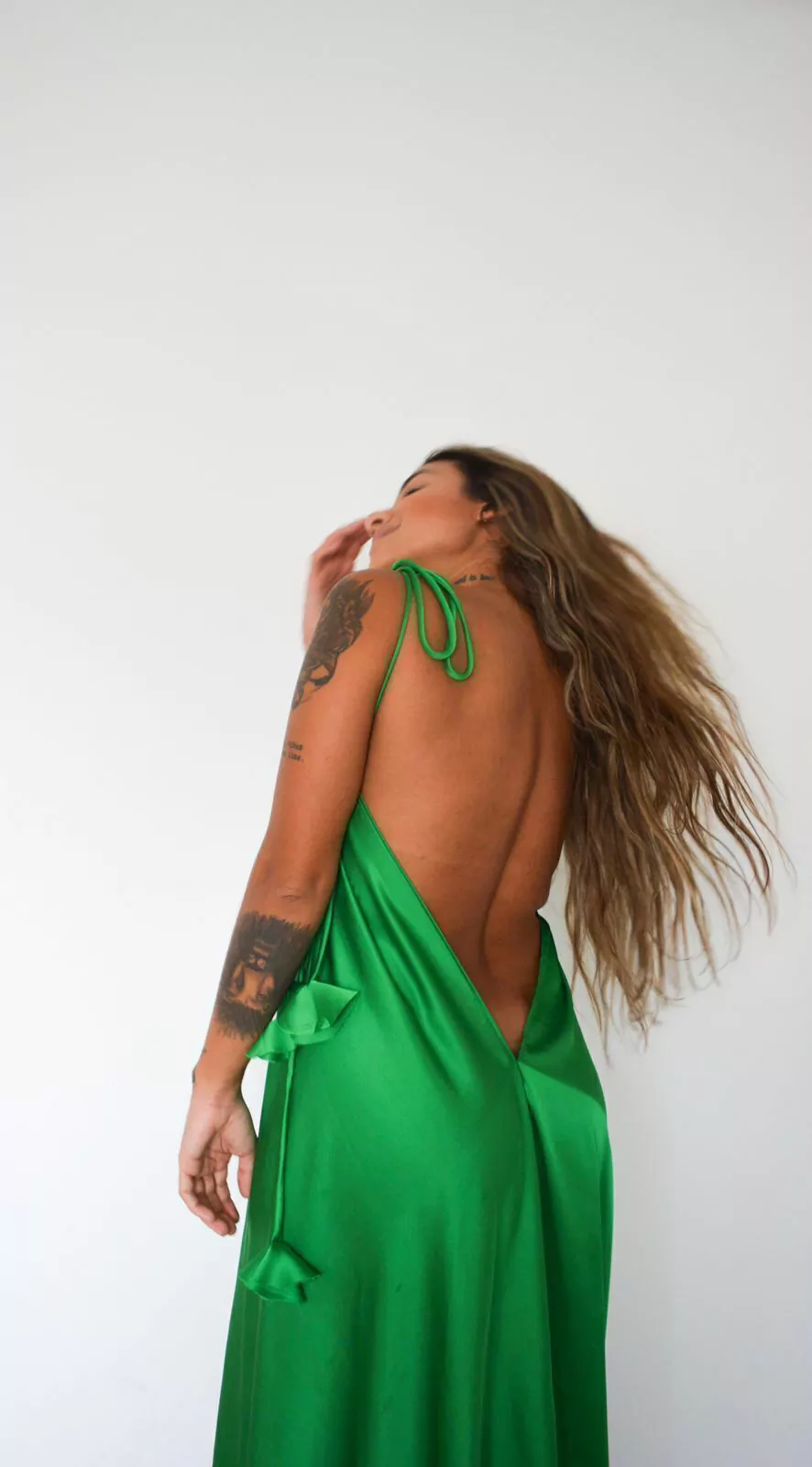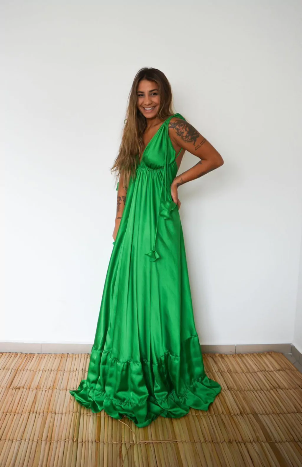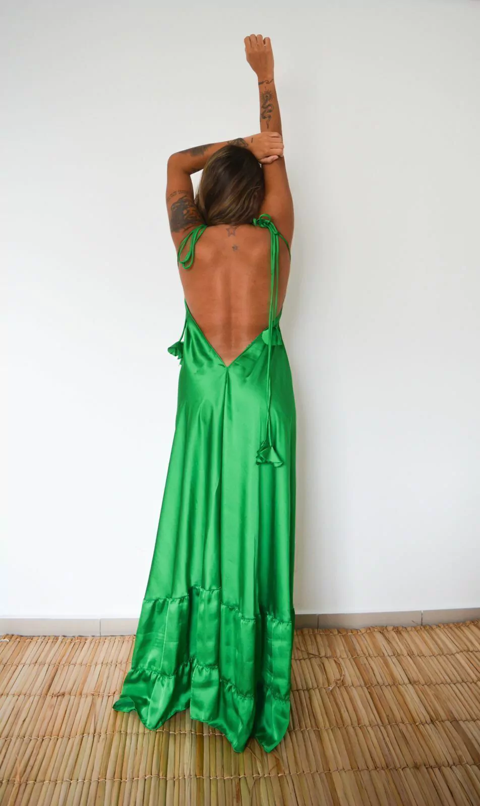 Vestido longo com decote frente e costas, possui diversas opções de amarrações e detalhe na barra e nas alças, modelo de saia A.